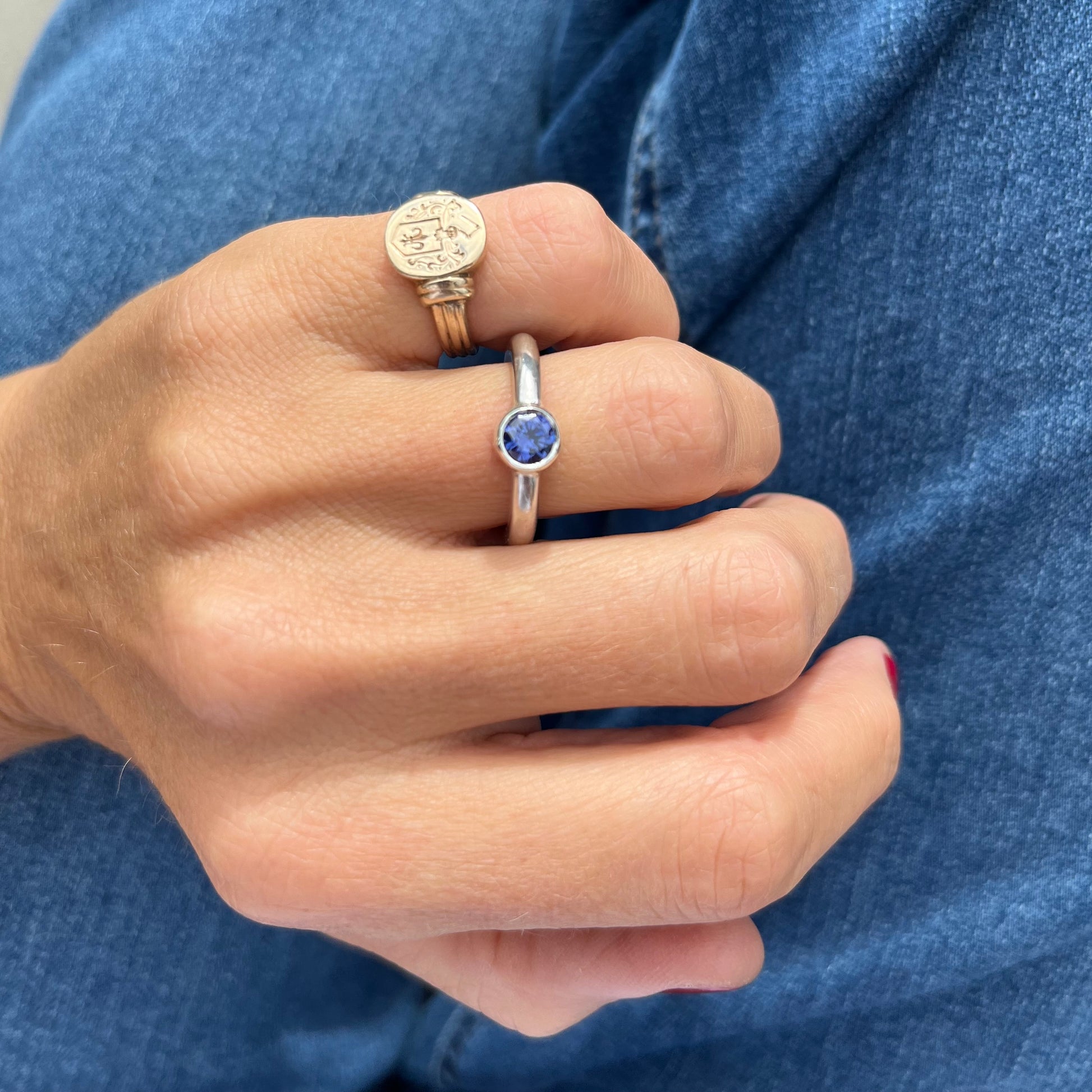 Denne ringen laget jeg først i 2000. Kul og chunky med kassefatning som gir den et robust men elegant utseende. Laget for hånd i 925 sølv her på verkstedet med blå zirkonia.