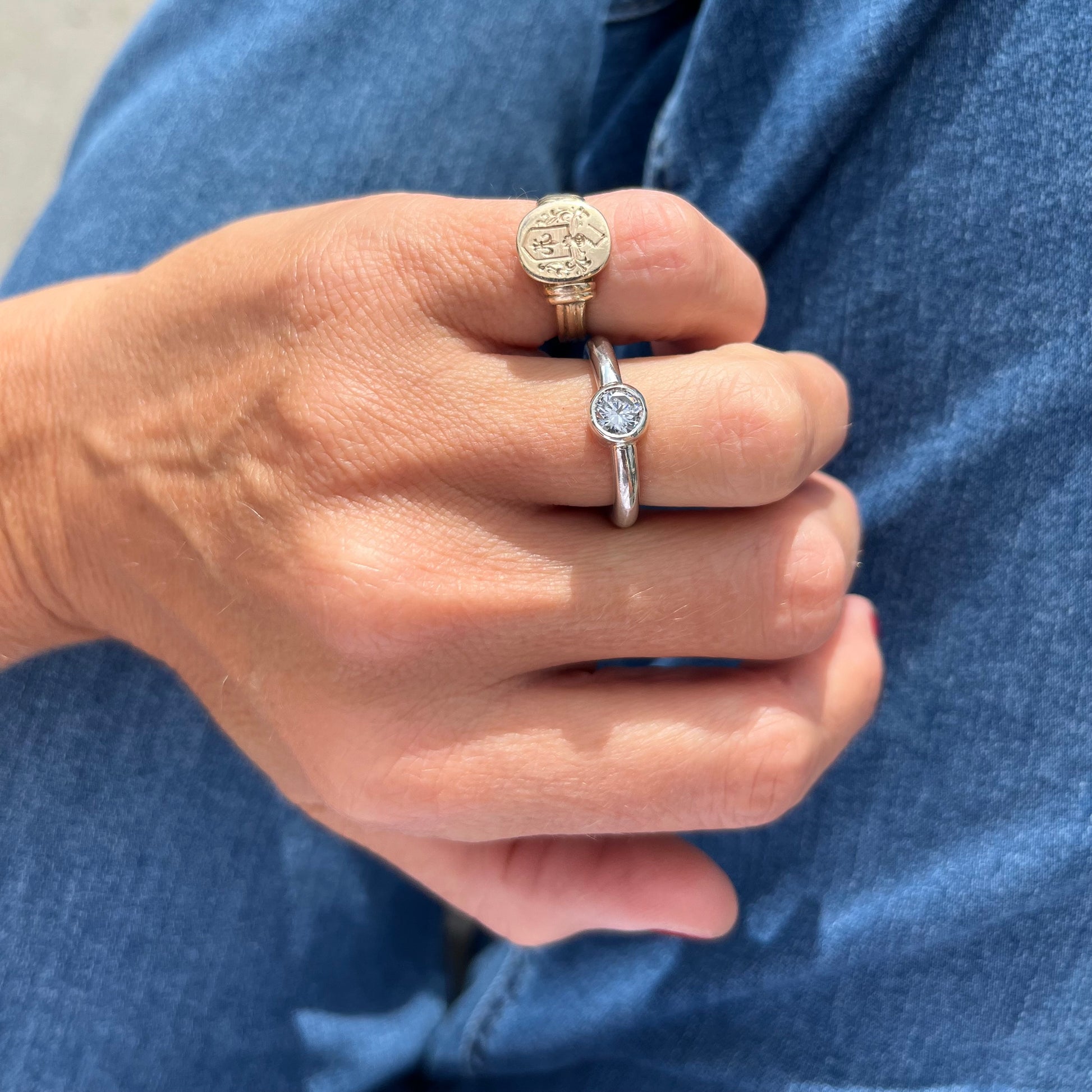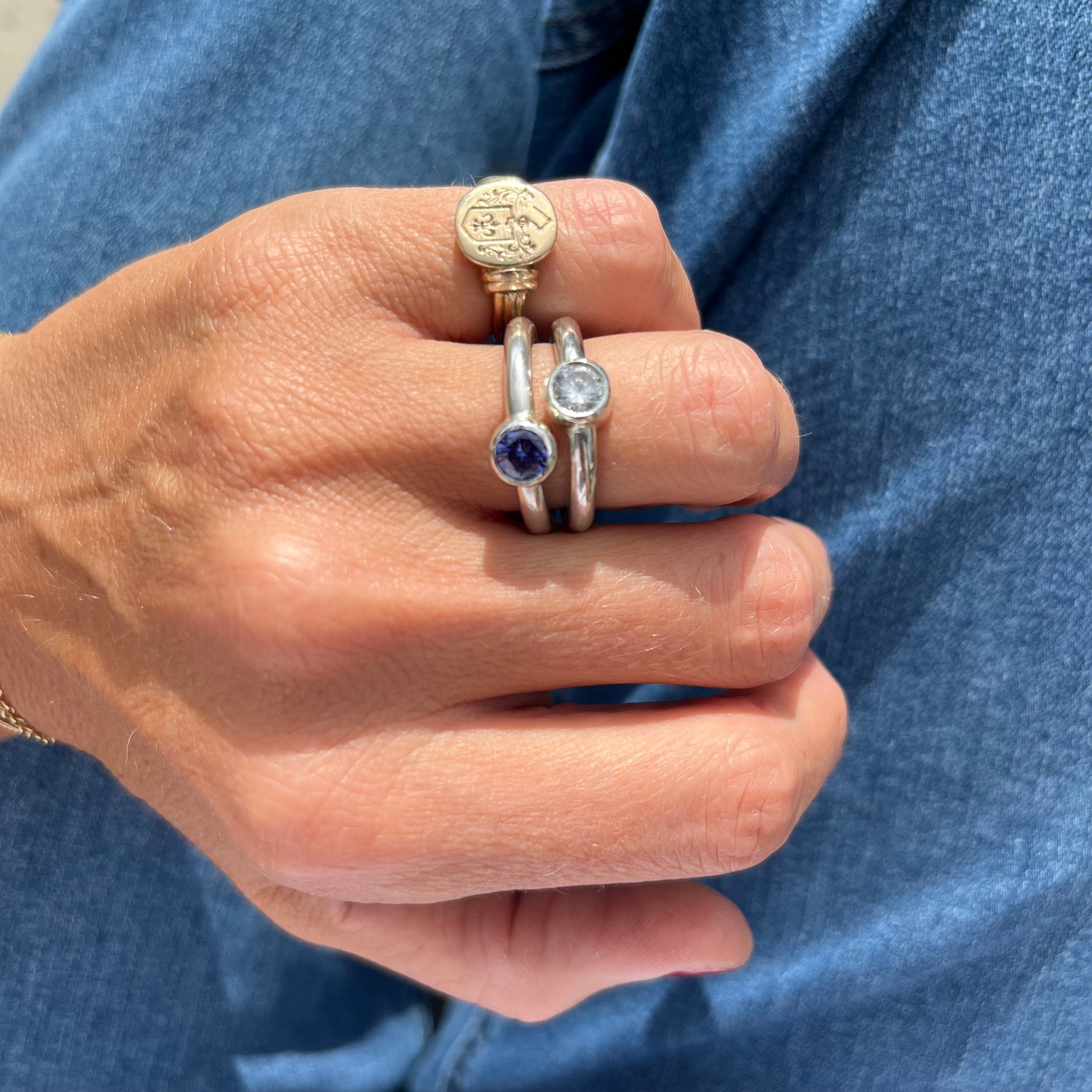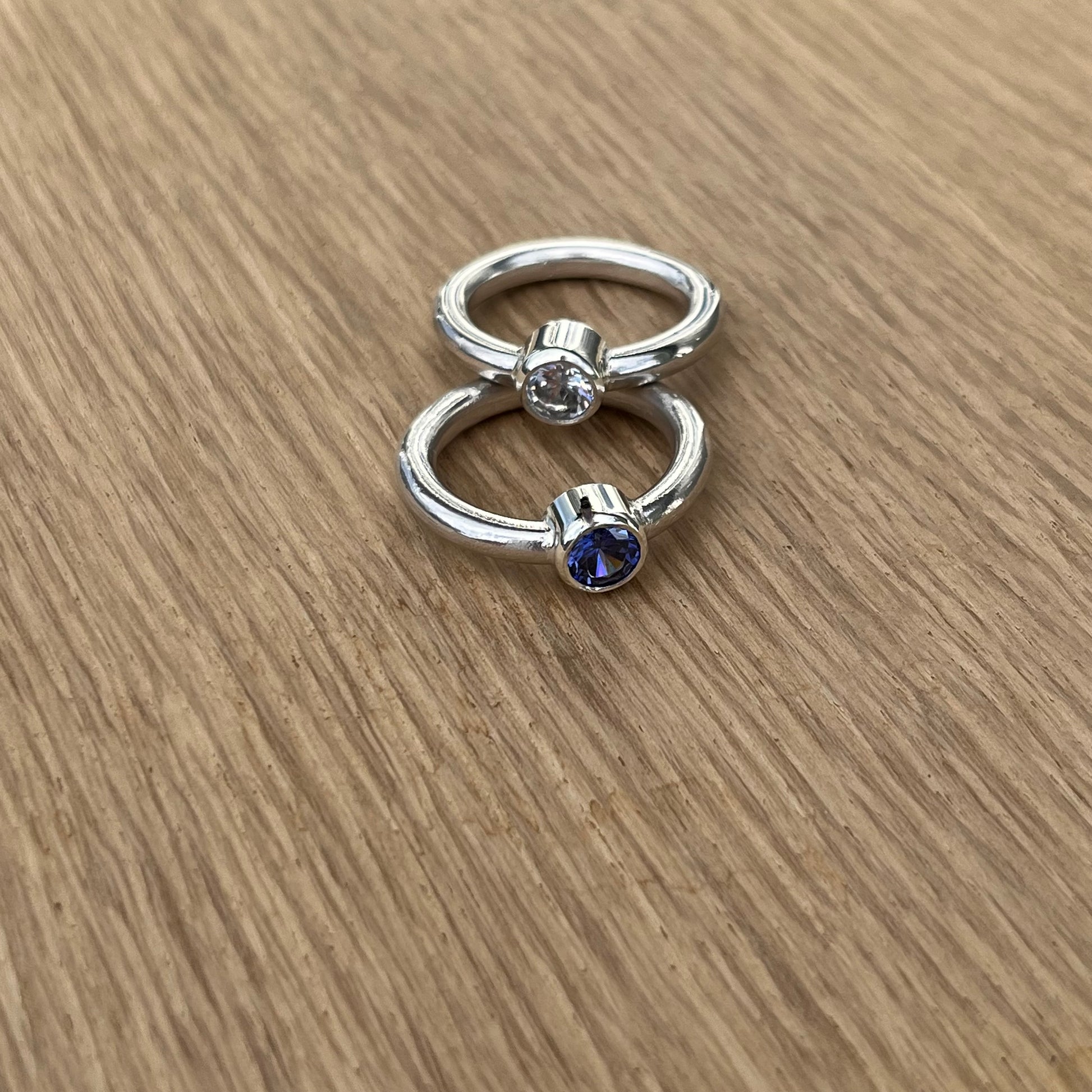 Denne ringen laget jeg først i 2000. Kul og chunky med kassefatning som gir den et robust men elegant utseende. Laget for hånd i 925 sølv her på verkstedet med blank zirkonia.