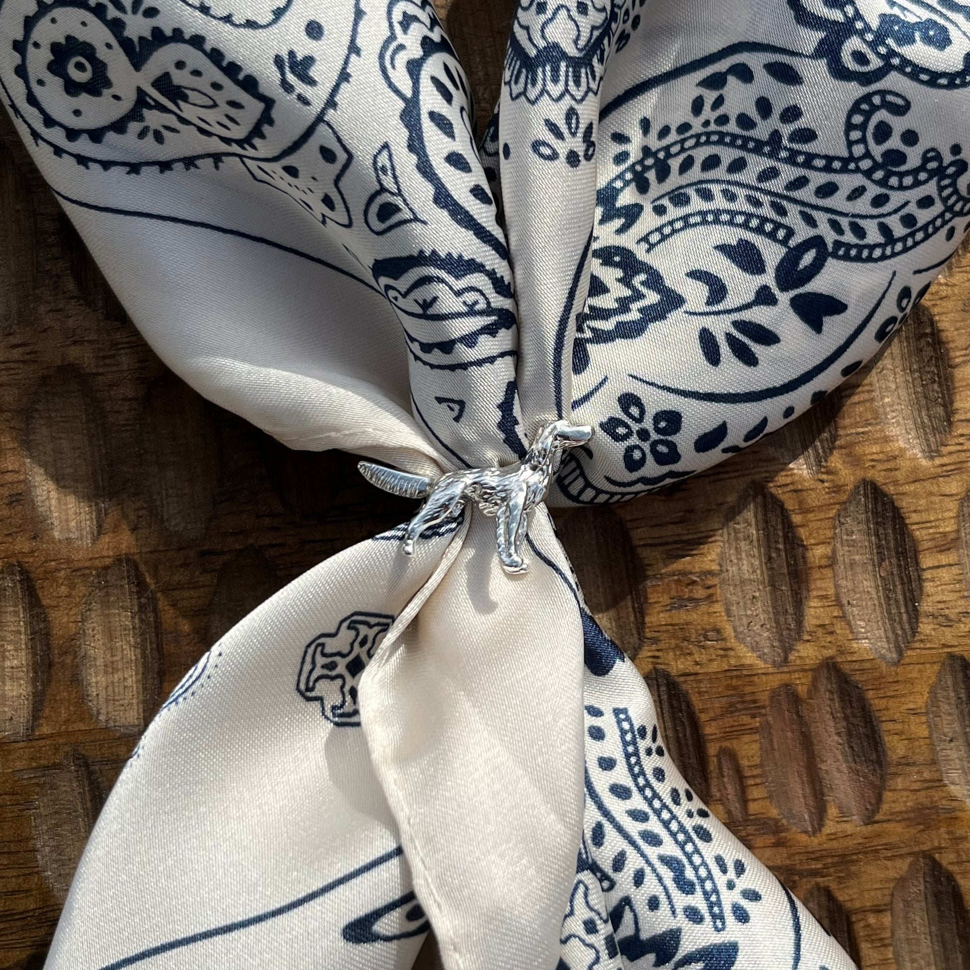 Her får du tidenes kuleste tilbehør. Silkesjal med en brosje som er en setter laget i 925 sølv her på verkstedet. Deilig i halsen og superkult tilbehør.
