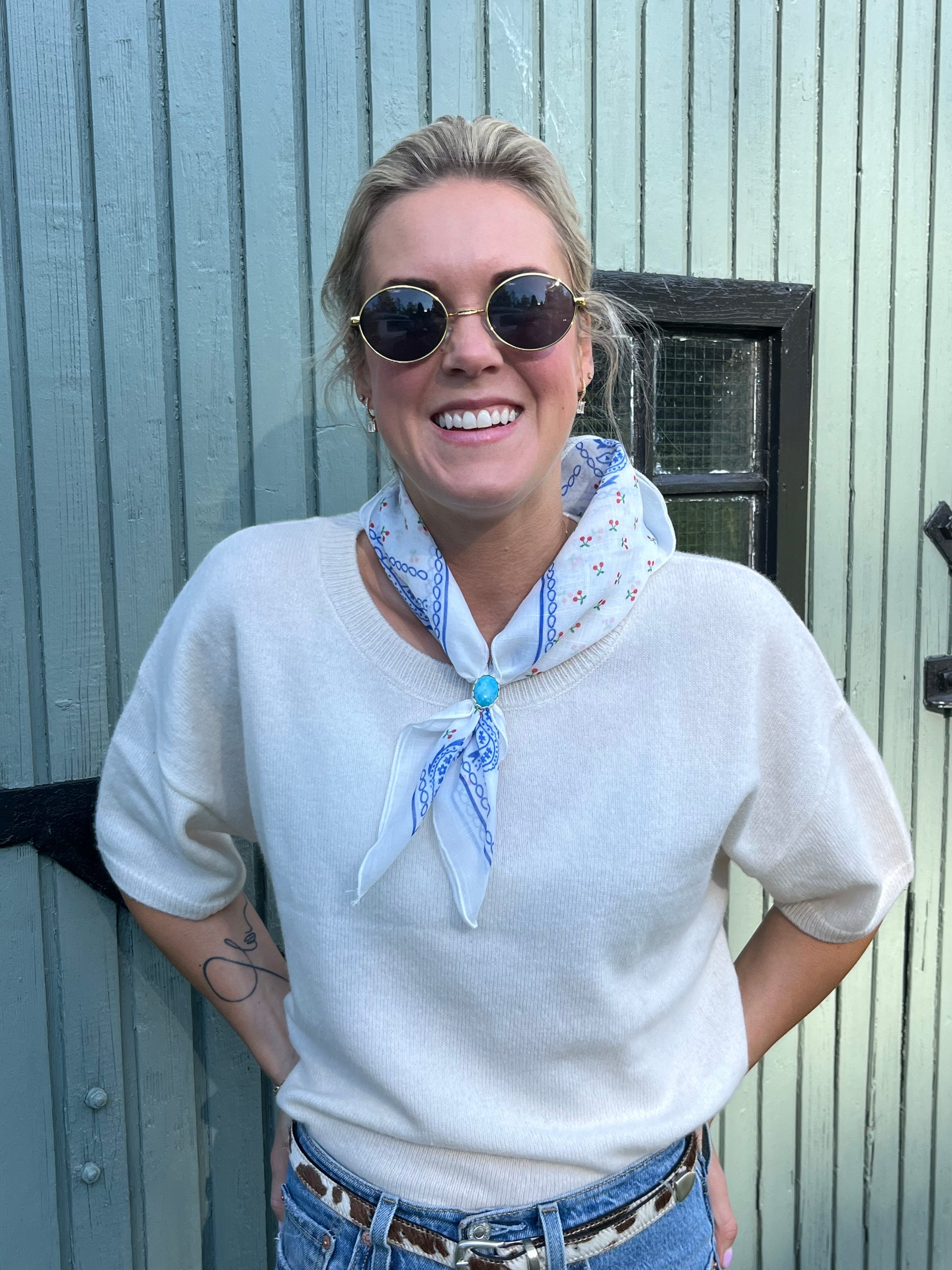 Her får du tidenes kuleste tilbehør. Silkesjal med en brosje som er laget for hånd i 925 sølv her på verkstedet med en turkis. Deilig i halsen og superkult tilbehør.