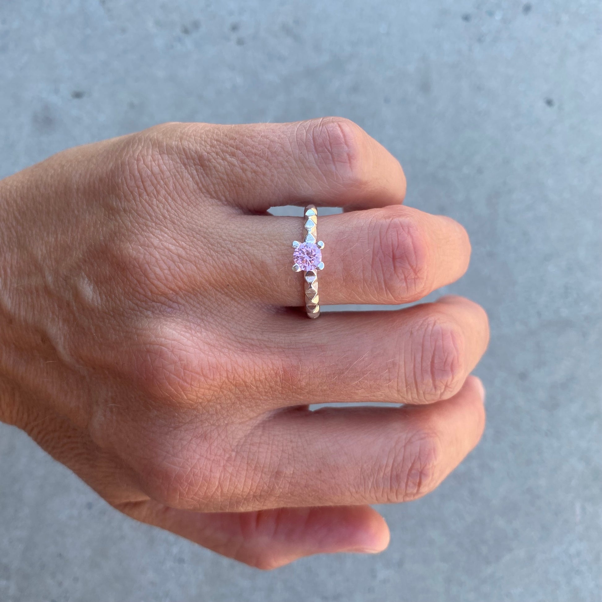 Denne kule ringen har en 5 mm rosa zirkonia i. Passer perfekt i en STACK med flere ringer men også fin alene. Laget i 925 sølv her på verkstedet.