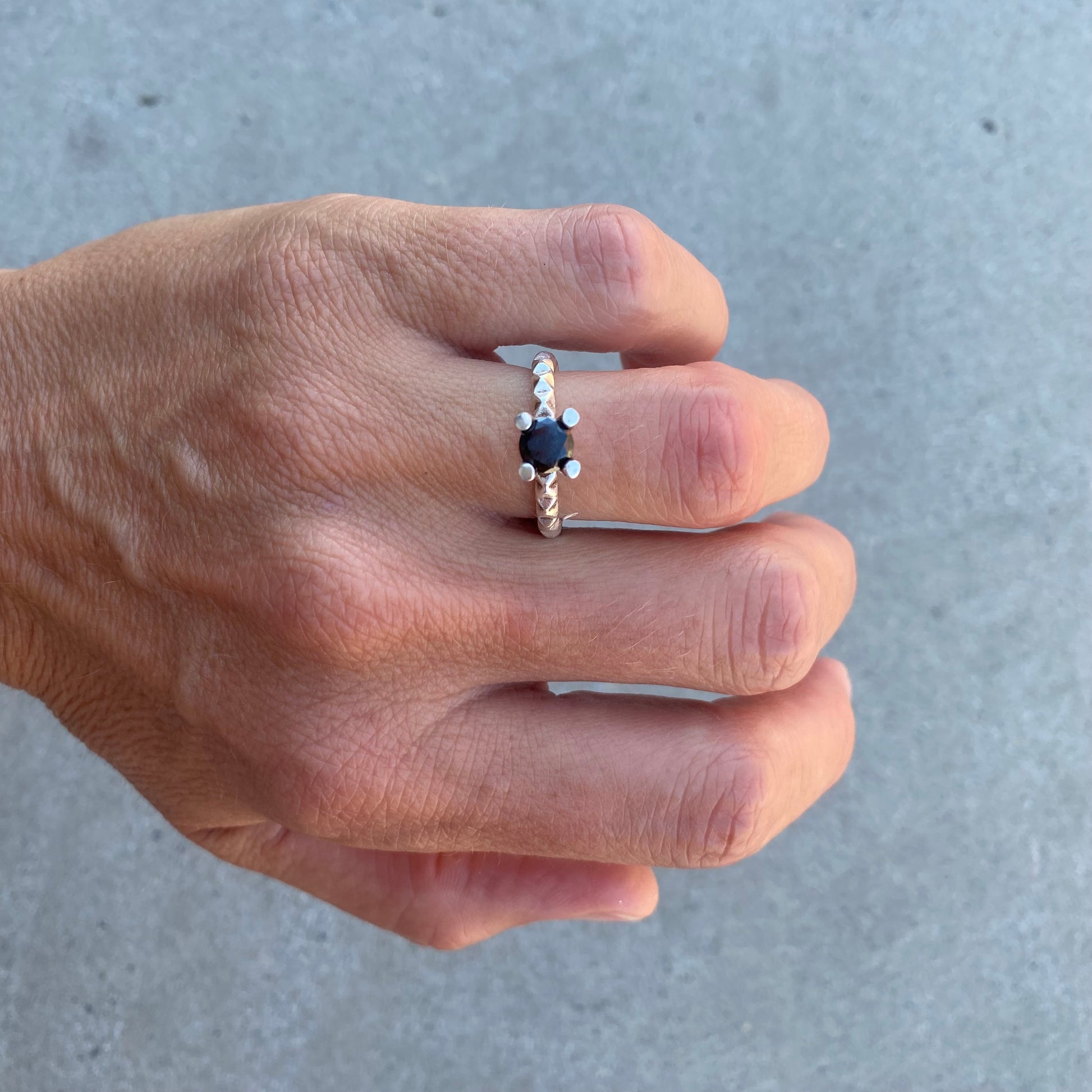 Denne kule ringen har en 5 mm sort zirkonia i. Passer perfekt i en STACK med flere ringer men også fin alene. Laget i 925 sølv her på verkstedet.