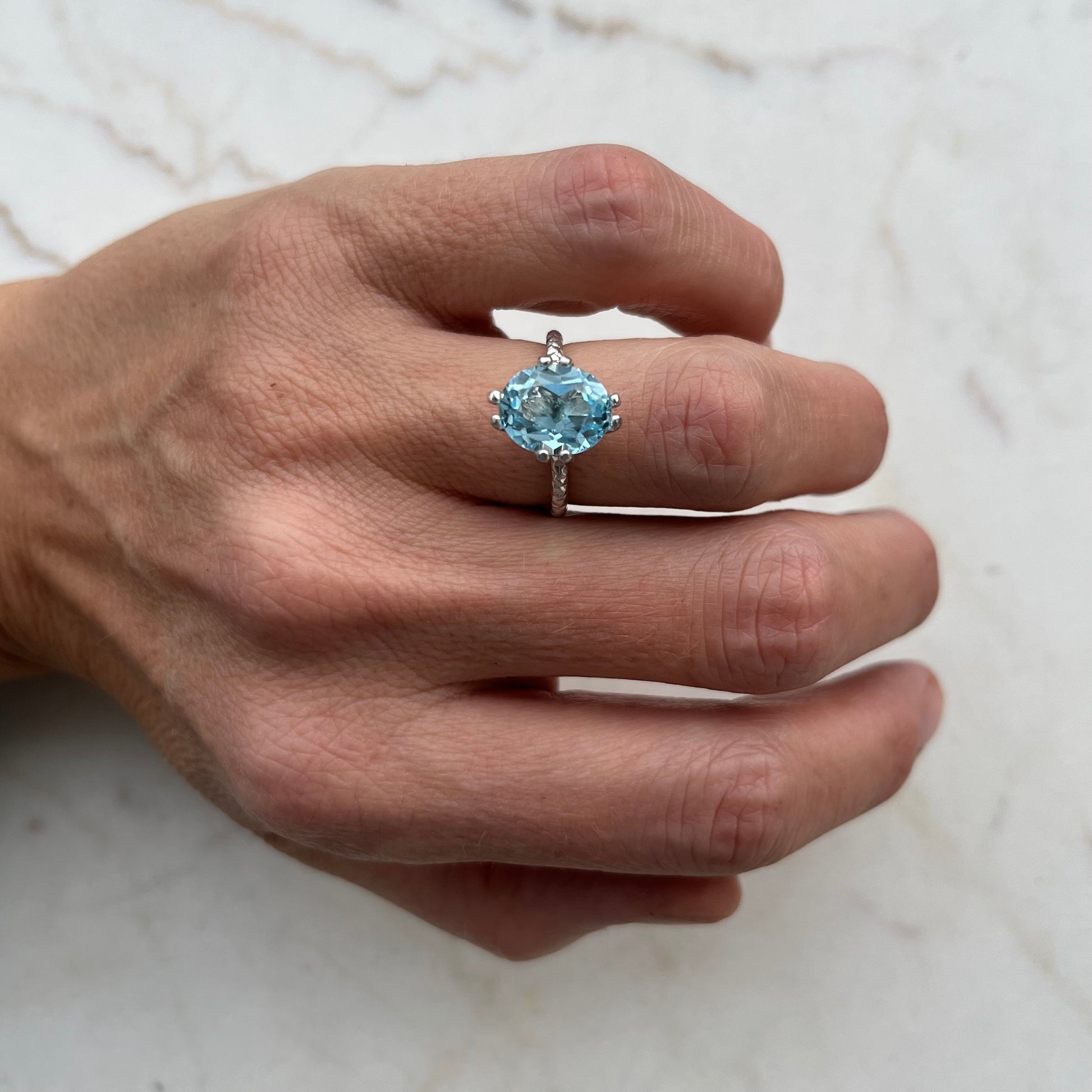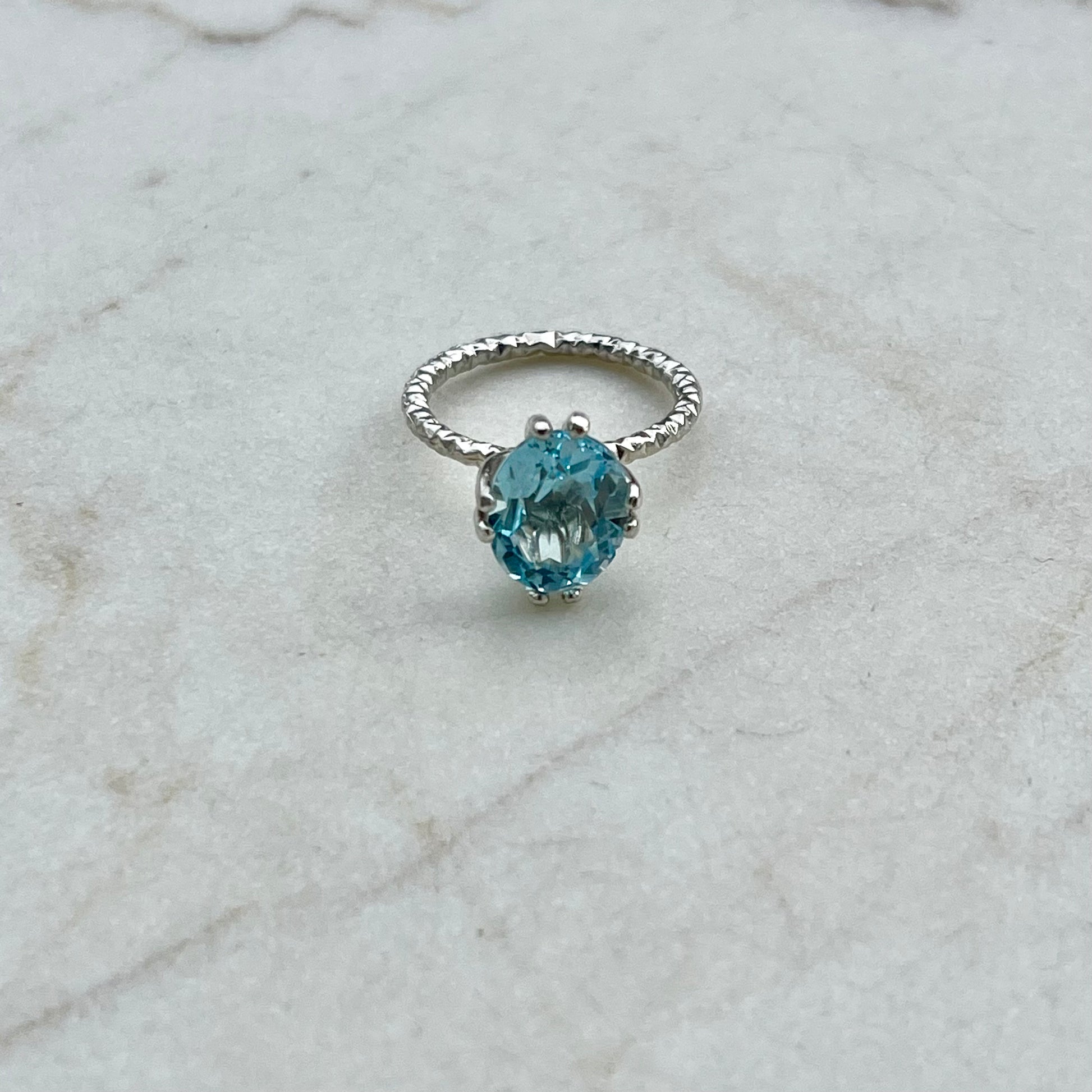 Nydelig Harriet ring med en lys blå topaz. Ringen er laget i 925 sølv her på verkstedet. Denne er i str 54. For andre størrelser - ta kontakt.