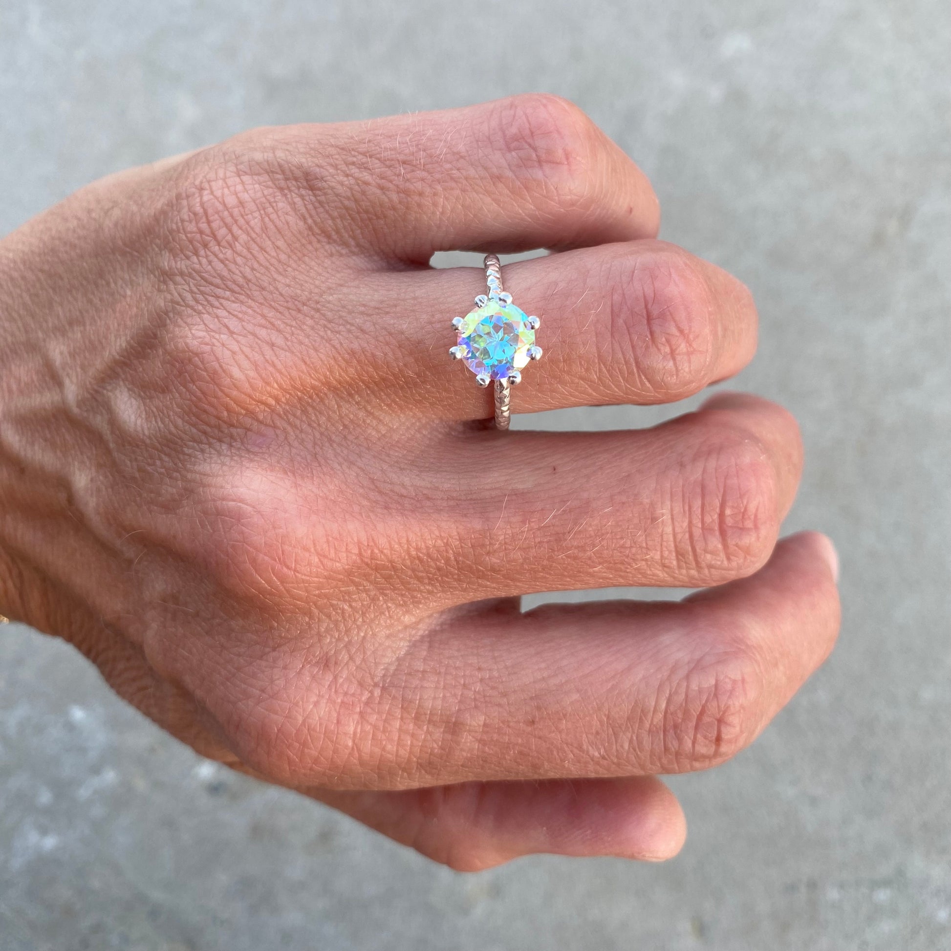 Nydelige Harriet med 8 mm mercury topaz . Den skifter farge ettersom lyset. Laget i 925 sølv her på verkstedet i Lommedalen.