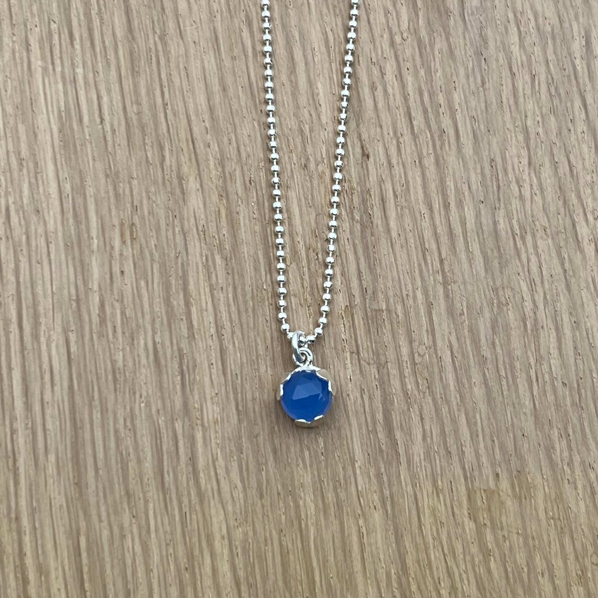 Superfint sølvkjede med en blå Chalcedon. Laget på verkstedet i 925 sølv. Fatningen består av hjerter som holder stenen.
