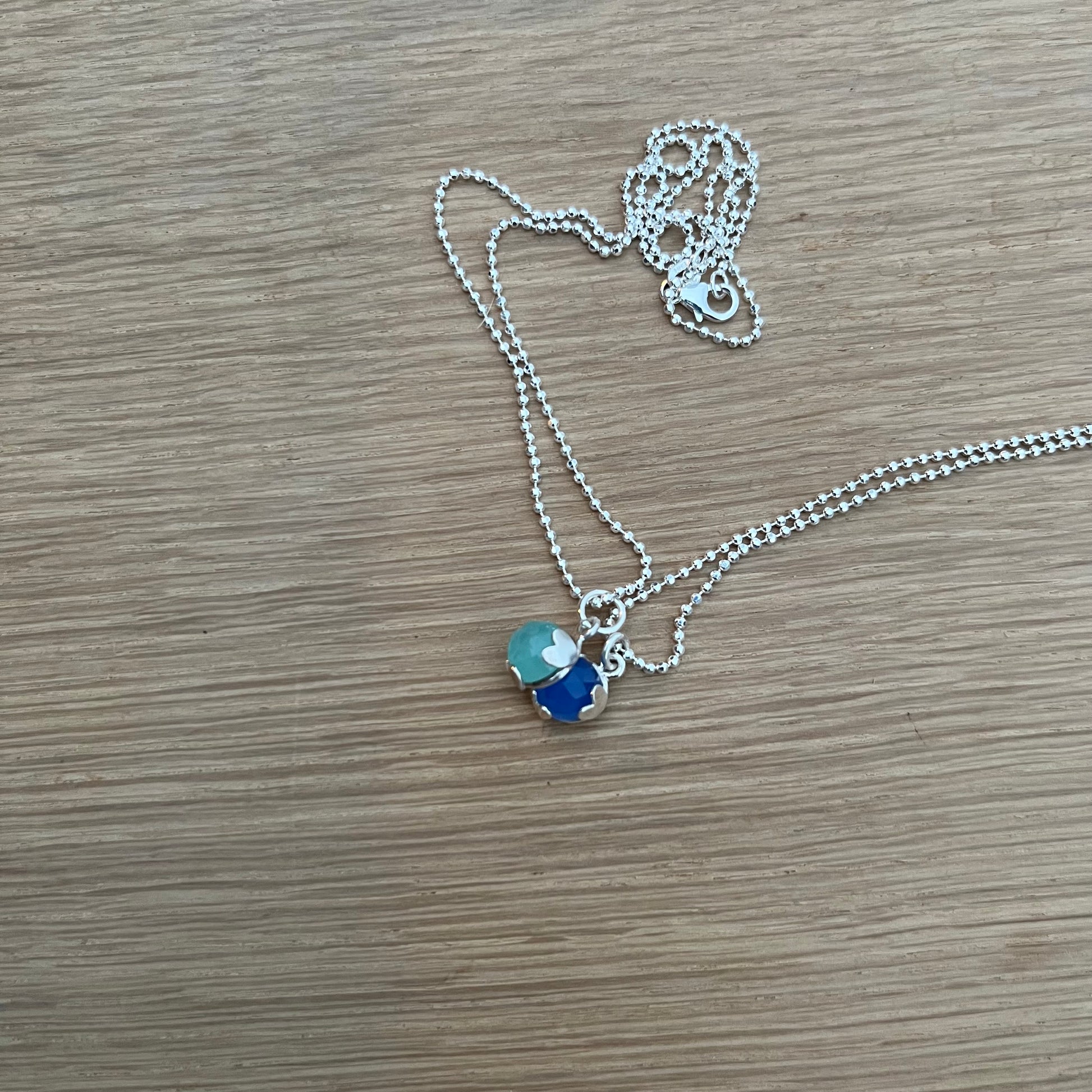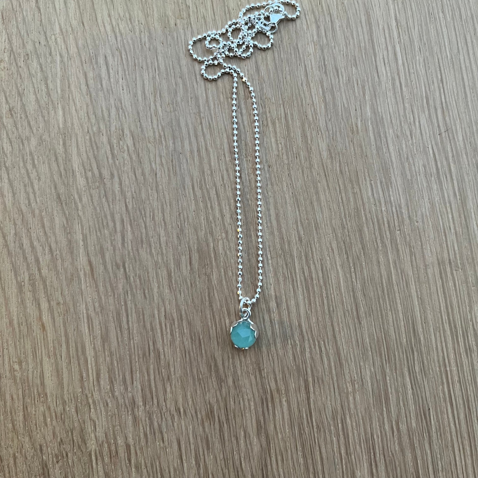Superfint sølvkjede med en lysegrønn Chalcedon. Laget på verkstedet i 925 sølv. Fatningen består av hjerter som holder stenen.