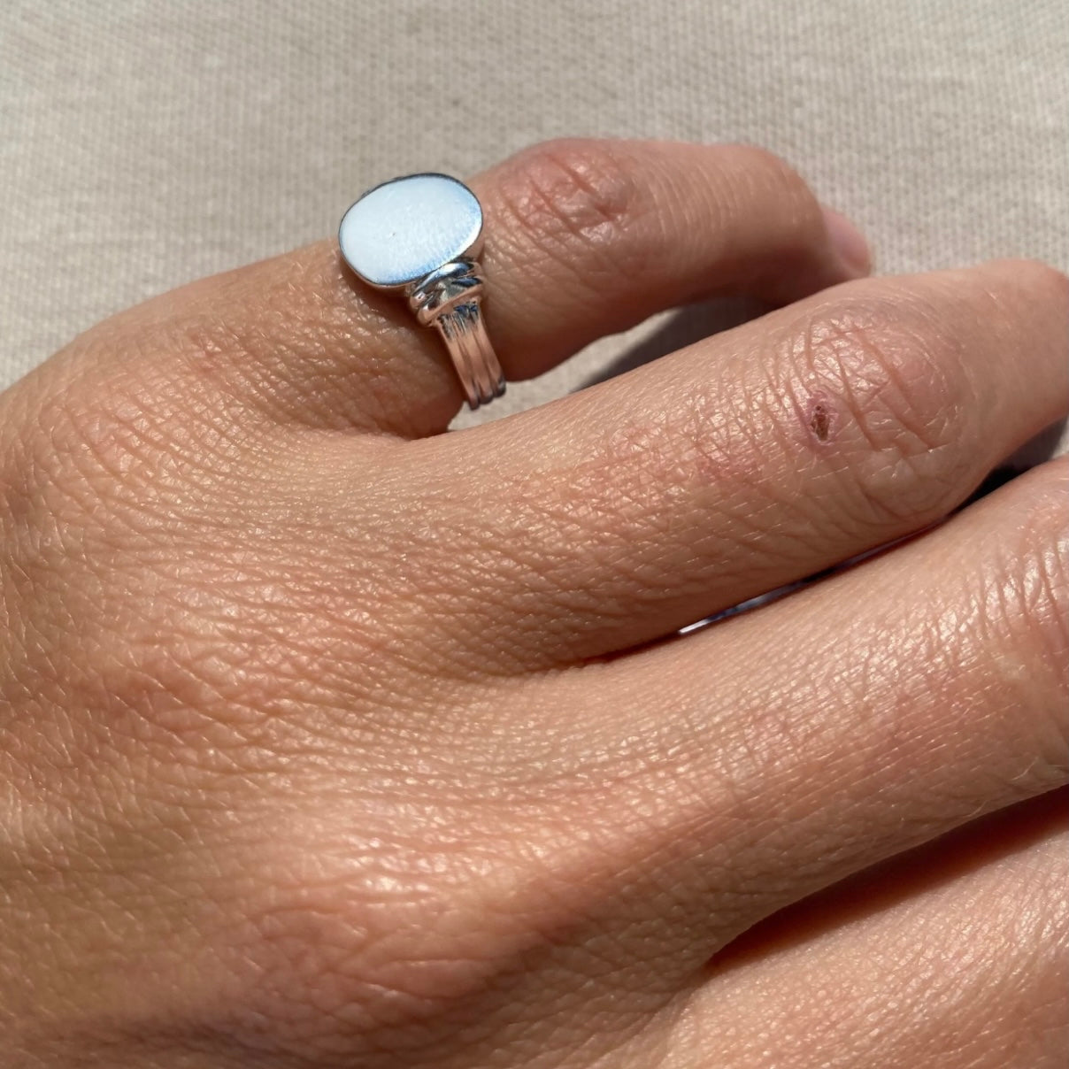 Massiv & kul signetring. Denne skiller seg ut med stripene på sidene og på ringskinnen. Kul alene og med gravering. Laget for hånd her på verkstedet i 925 sølv.