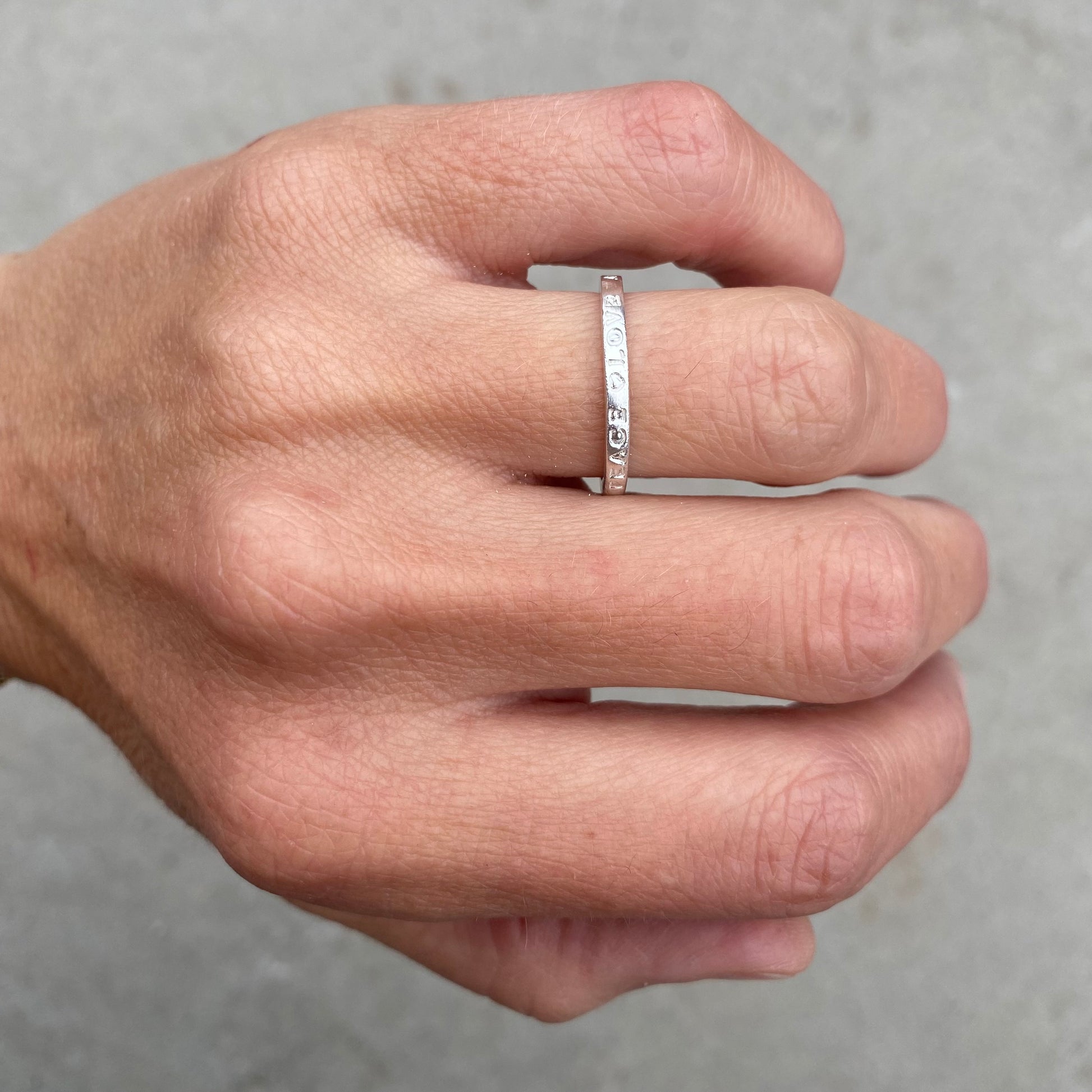 Denne kule sølvringen er 2 mm bred med peace and love tekst rundt hele. Laget på verkstedet i 925 sølv. Kul alene eller i STACK .