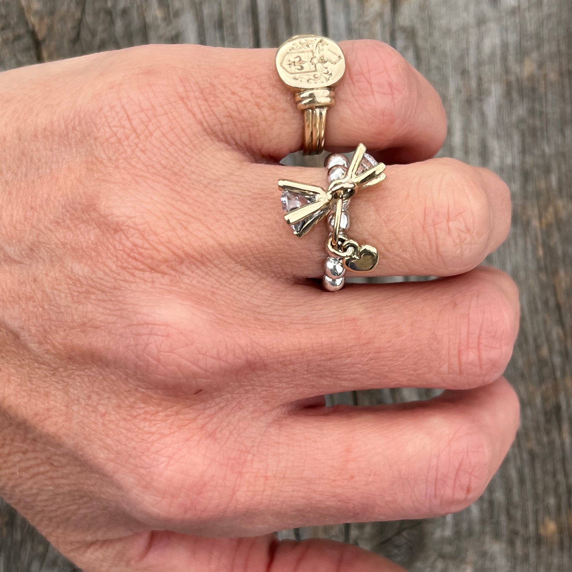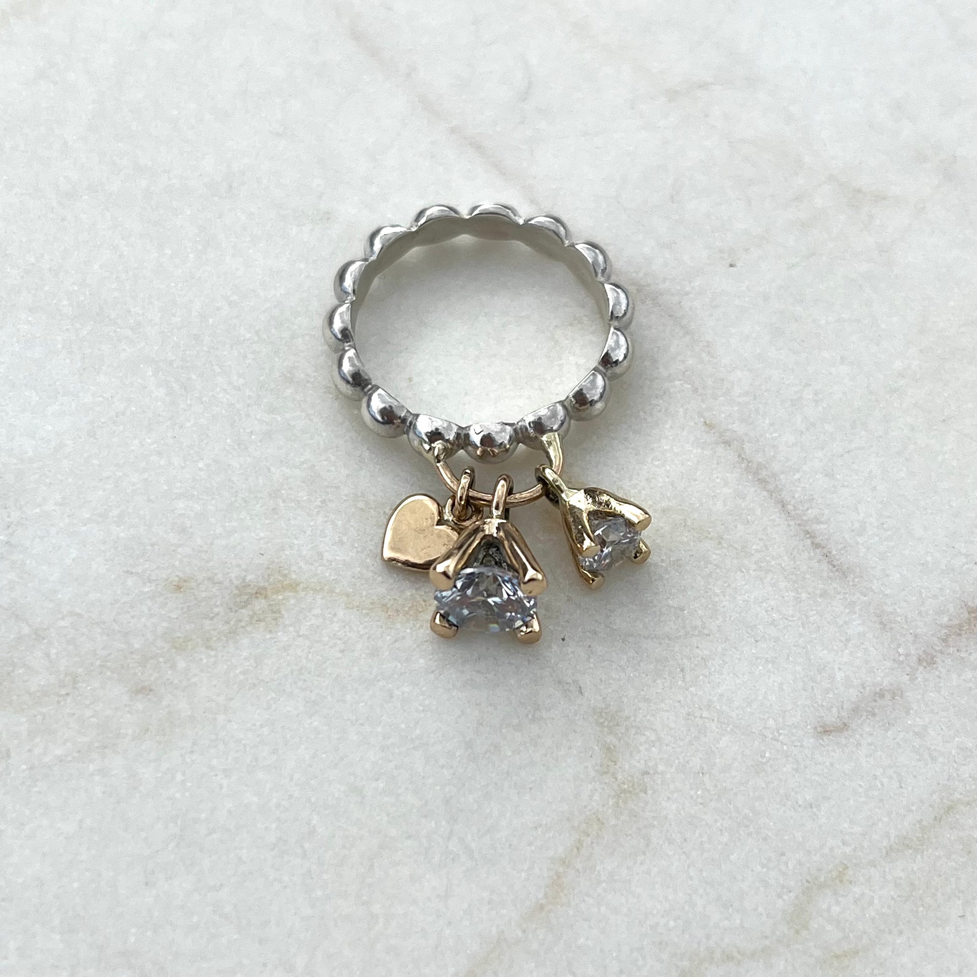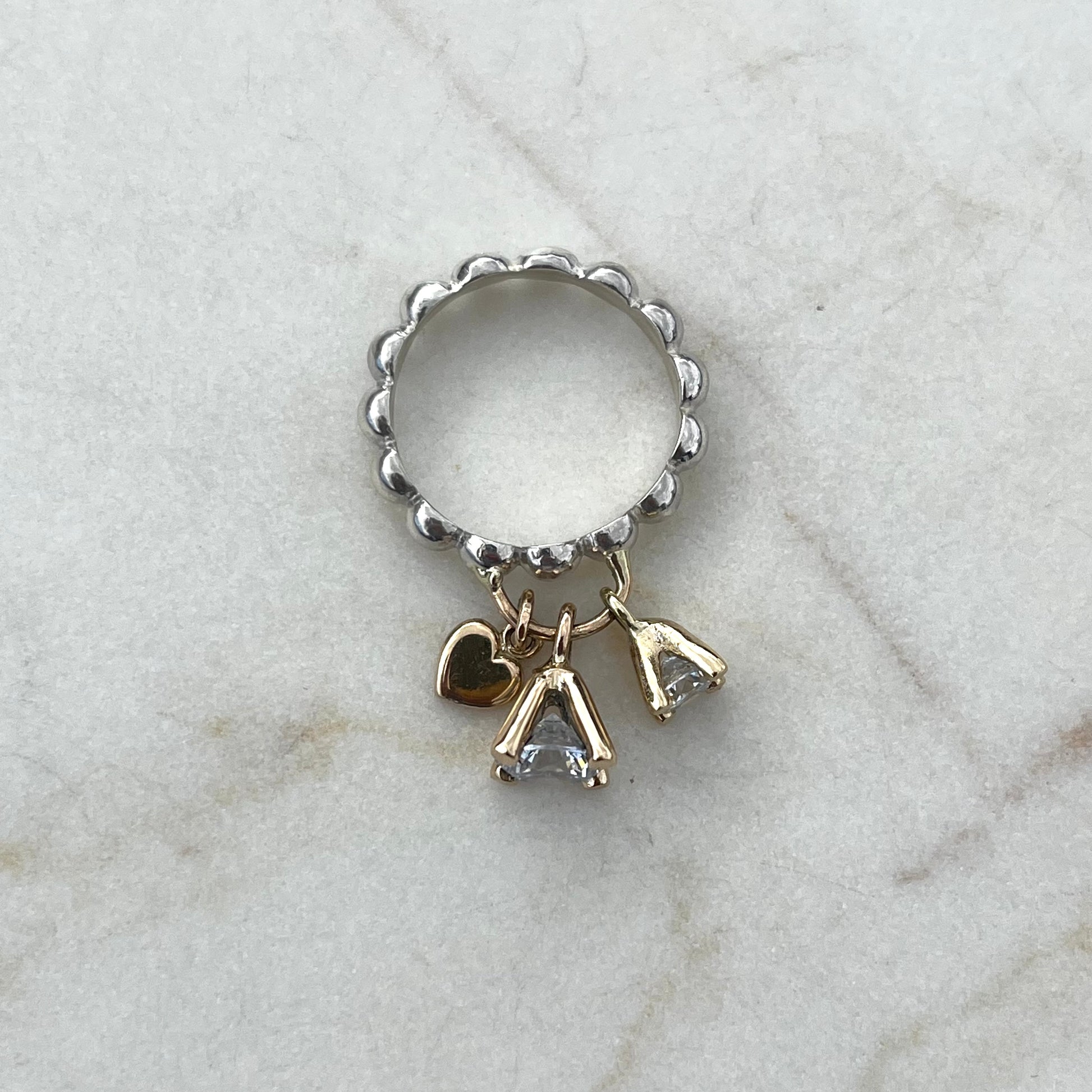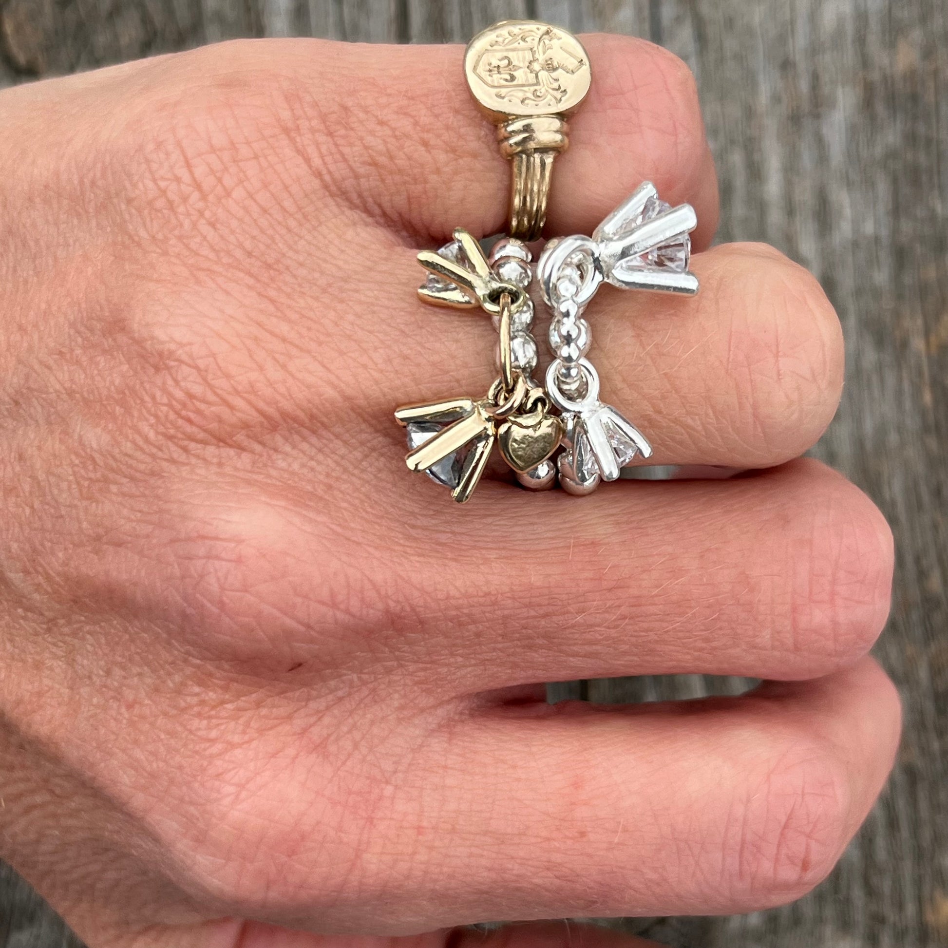Liker du stæsj, er dette ringen for deg. Superkul alene og i en stack. Anhengene er i gull og ringen i sølv. Perfekt om du liker å blande sølv og gull. Laget på verkstedet i 924 sølv og 585 gull.