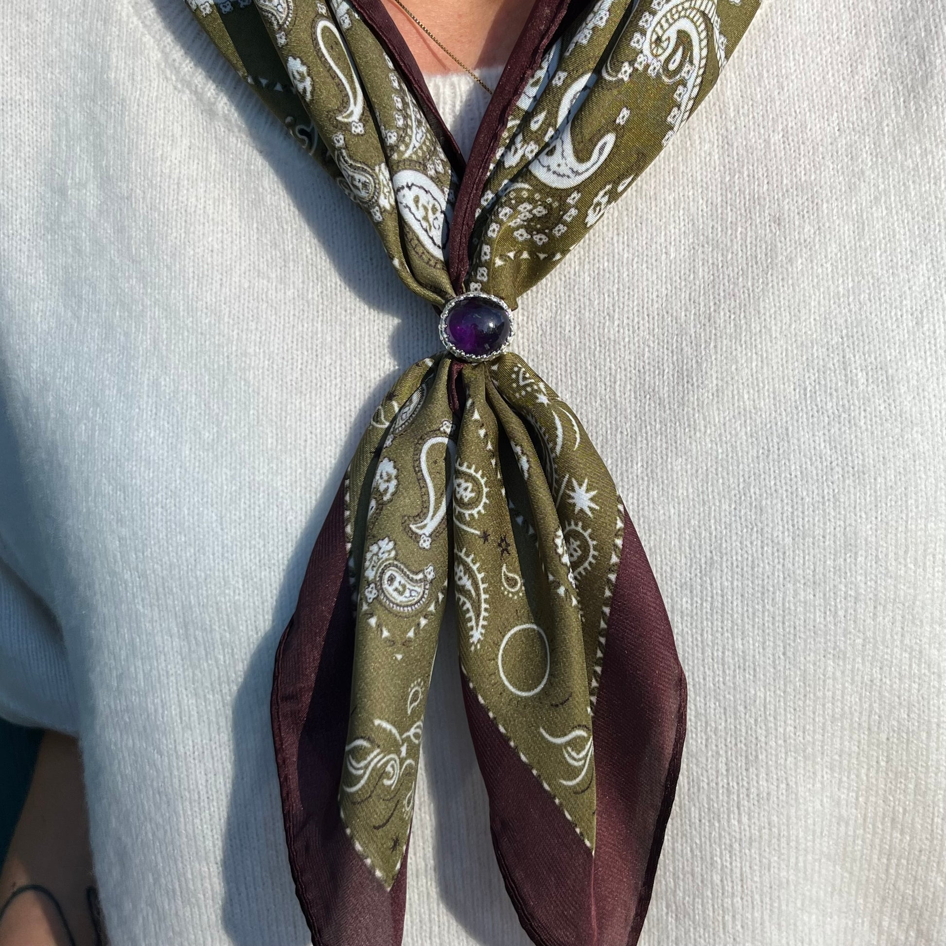 Her får du tidenes kuleste tilbehør. Silkesjal med en brosje som er laget for hånd i 925 sølv her på verkstedet med en ametyst. Deilig i halsen og superkult tilbehør.